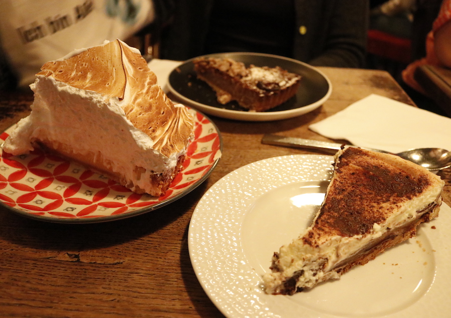 _MG_4479 手前右がチョコレートタルト。上の白い層はマスカルポーネをバーナーであぶってる。その下のチョコレートクリームは薄い色と濃い色2層、タルトの食感が一番ザクザクしていた。いろんなお皿で提供されても可愛くて、おしゃれに感じたのはパリマジック?
